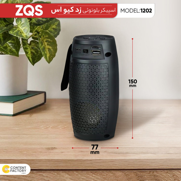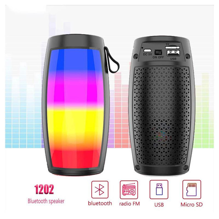 اسپیکر قابل حمل 1202 یک اسپیکر بلوتوثی رم و فلش خور با باند 2 اینچی و توان خروجی 5 وات است .پشتیبانی از اتصالات بی سیم نظیر بلوتوث تا برد 10 متر، پشتیبانی از کارت حافظه ، فلش usb و پشتیبانی از رادیو FM.دارای کلید خاموش و روشن اسپیکر ،کلید های مدیریت صدا ،پخش موسیقی و تغییر حالات نورپردازی از ویژگ های این اسپیکر می باشد. جنس بدنه اسپیکر 1202 از جنس پلاستیک ABS با کیفیت و مقاوم و همچنین دارای باتری لیتیومی با ظرفیت 500Mah ساعت با قابلیت شارژ مجدد می باشد.