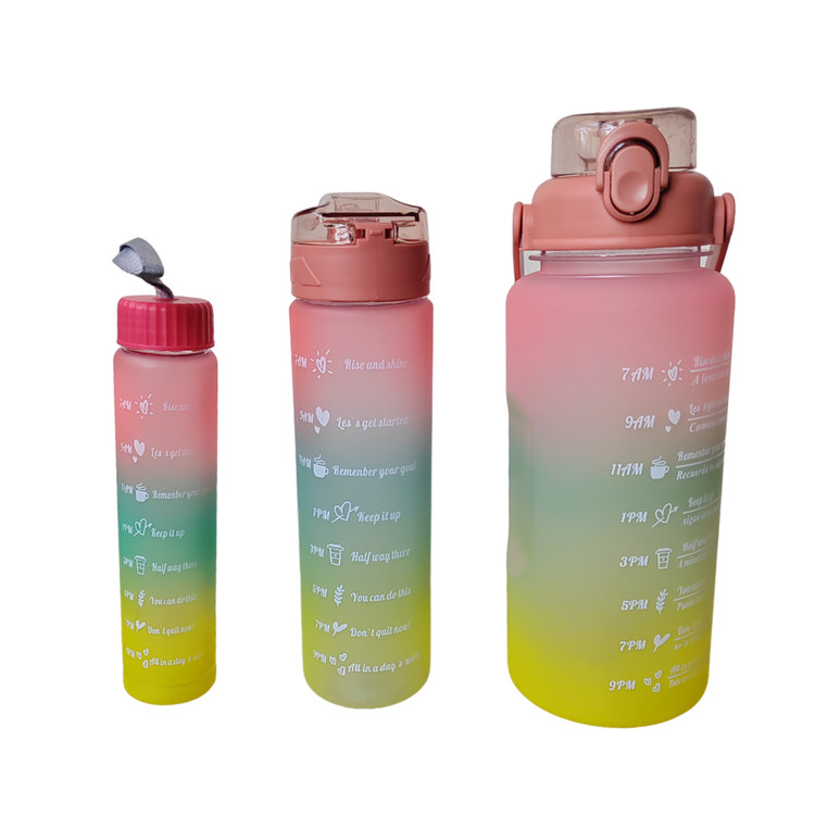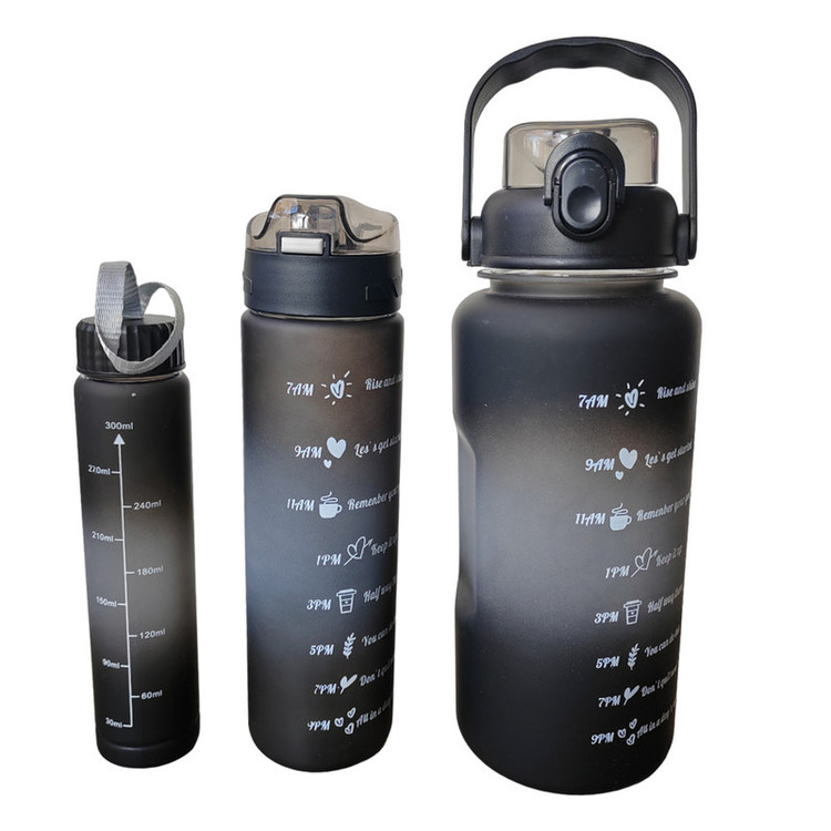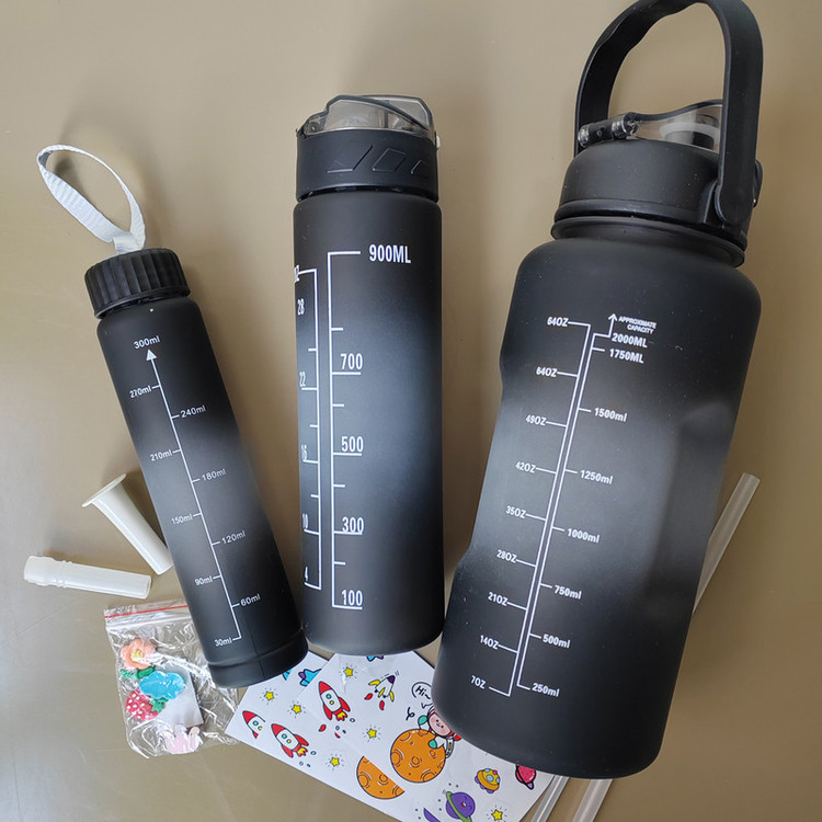 شامل سه قمقمه 2 لیتر،900 میلی لیتر و 400 میلی لیتر سایز بزرگ و متوسط نی دار، درب قفلی سایز کوچک دارای درب پیچی قمقمه ها همراه استکیر های ساده و برجسته هست که میتوانید به سلیقه ی خود قمقمه هارا دیزاین کنید