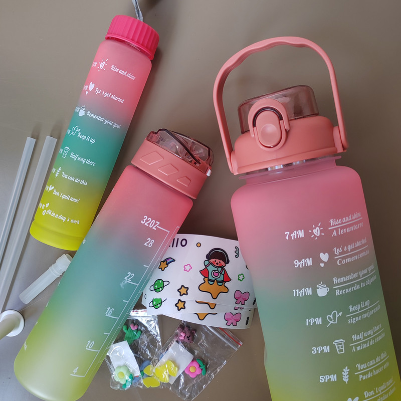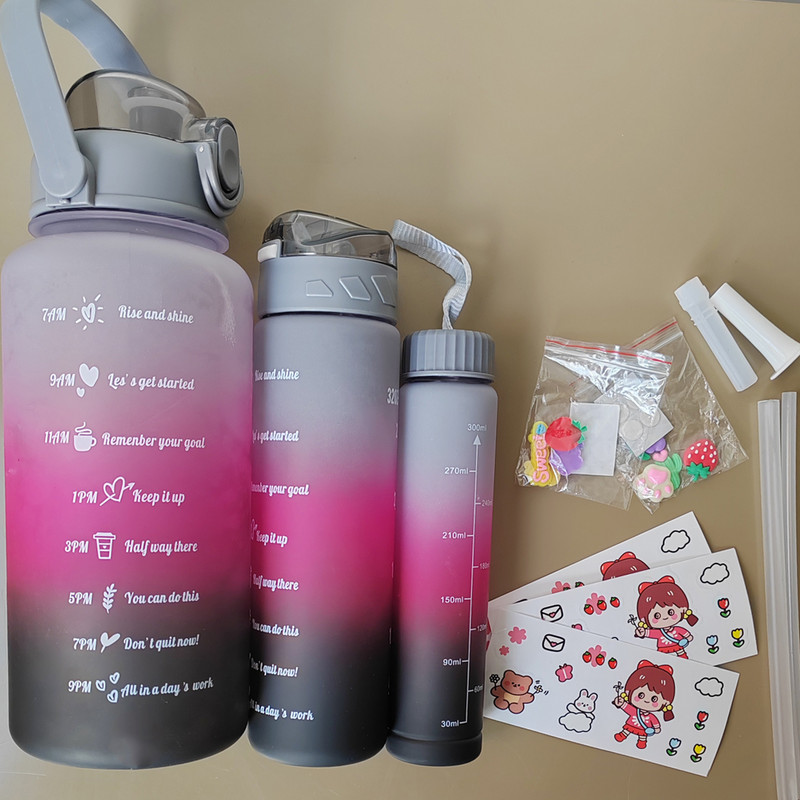 شامل سه قمقمه 2 لیتر،900 میلی لیتر و 400 میلی لیتر سایز بزرگ و متوسط نی دار، درب قفلی سایز کوچک دارای درب پیچی قمقمه ها همراه استکیر های ساده و برجسته هست که میتوانید به سلیقه ی خود قمقمه هارا دیزاین کنید